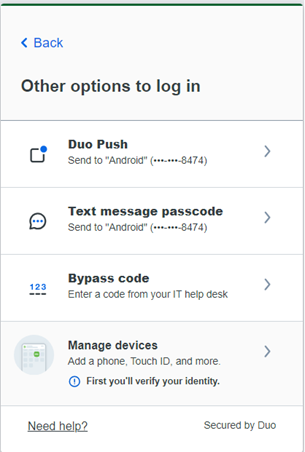There are several different methods to authenticate. By default, Duo will attempt to send a Push notification to your device, however you can also select 'Other Options' on the initial Duo prompt.