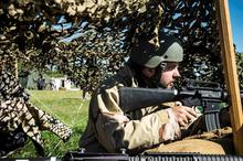 Air Force scientists and engineers donned battle gear and grabbed M-16 rifles for a combat exercise at Wright State's Calamityville to field-test the technologies they helped develop in the lab.